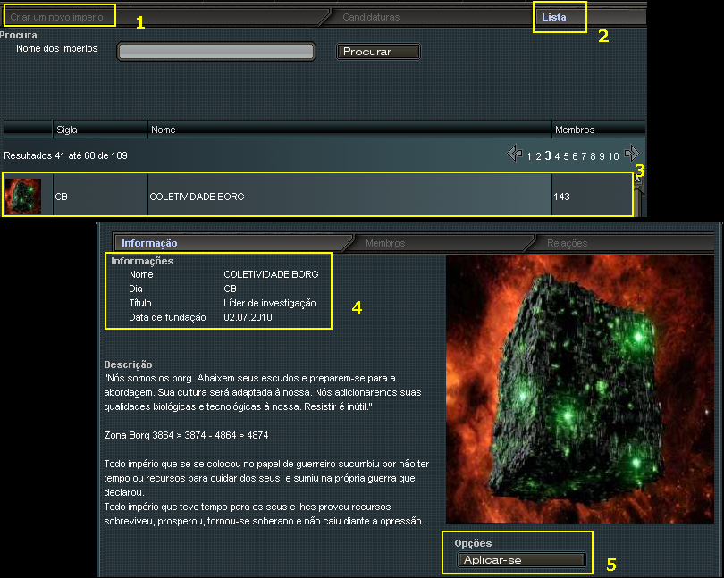 5 - Botão de se aplicar. Assim feito, você estará se candidatando ao Império, onde terá de aguardar aceitação da liderança do mesmo.