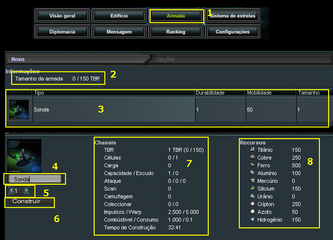 2 - Dentro do Estaleiro, terá o indicativo de sua TBR (que nada mais é que o limite total de sua armada), a cada estaleiro construido, você ganha 150 de TBR, ou seja, podendo chegar no máximo de 7500, quando tiver nv10 de estaleiro nos 5 planetas. Cada nave tem um valor em células, este mesmo valor representa o gasto em TBR. Como a sonda tem 1 célula, logo, ao faze-la, gasta-se um de tbr.