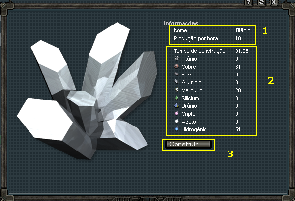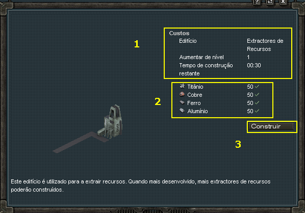 1 - Edifício disponível para construção. Basta clicar que abrirá uma janela com alguns dados e confirmação.